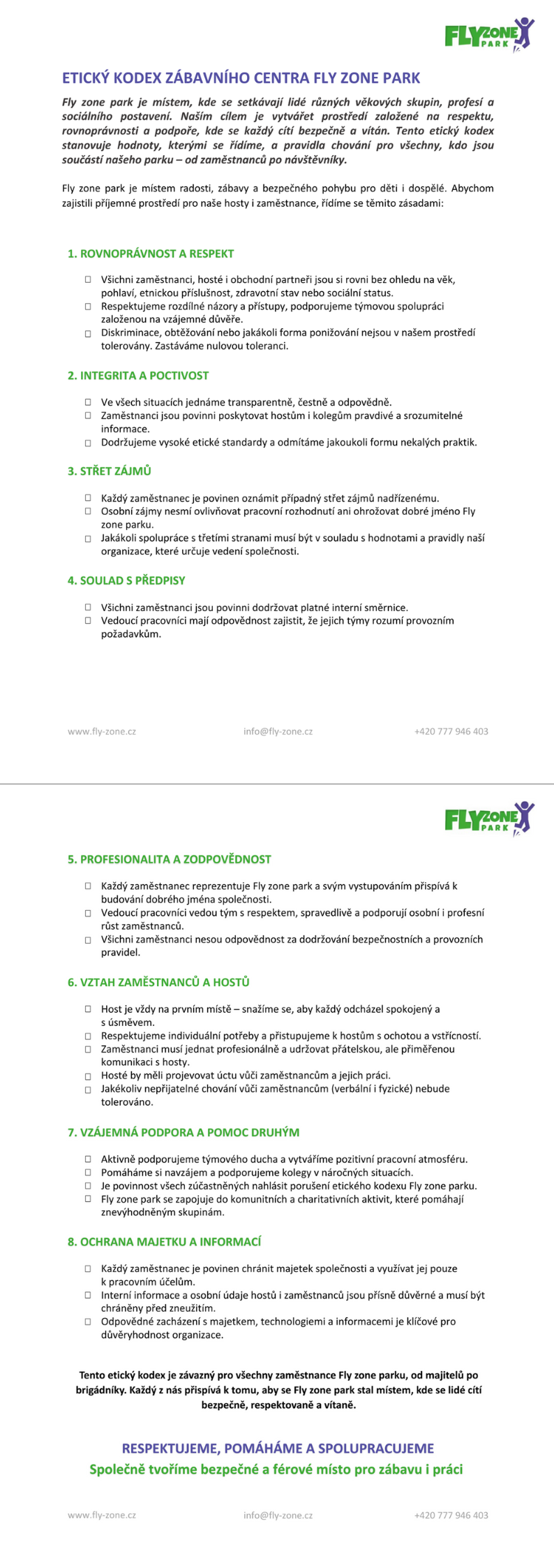 Navíc máme svůj Etický kodex, který slouží jako kompas pro každého zaměstnance. Pomáhá jasně nastavit, co je důležité pro majitele centra i celý tým – ať už jde o přístup k návštěvníkům, kolegům nebo hodnoty, na kterých Fly zone park stojí.