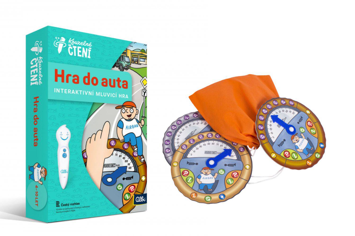 Interaktivní hra na cesty! Cílem hry je správně odpovídat na otázky, které jsou zaměřené na silniční dopravu a dopravní výchovu - otázky jsou rozděleny do dvou úrovní náročnosti. Hra ovšem obsahuje mnoho dalších otázek na různá témata, veselé dopravní písničky a spoustu zvuků. Dítě si může hrát samo nebo s ostatními cestujícími. Hru snadno sbalíte do cestovního pytlíku - obsahuje 3 herní tabulky ve tvaru volantu a pravidla.